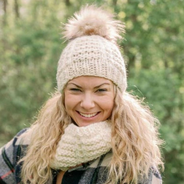 Patterns shown are the Quick Chunky Cowl and Quick Chunky Hat.